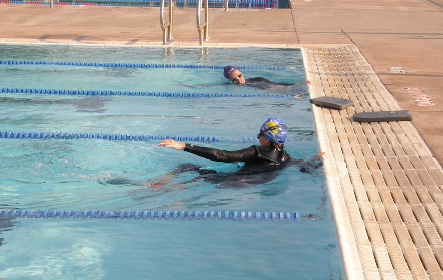 Ten 3-hour sessions of one hour on land followed by 2 hours in the pool. Discussion, video, and video playback of your swimming daily. One session of 1 hour on Zoom after you’ve gone home and swum on your own.