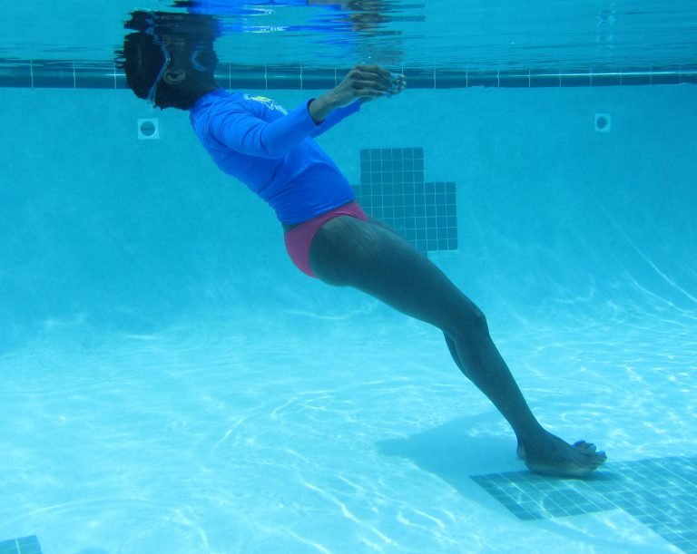 We begin SloMo in standard-depth water, waist deep where you learn basics like how to put your face in water happily.