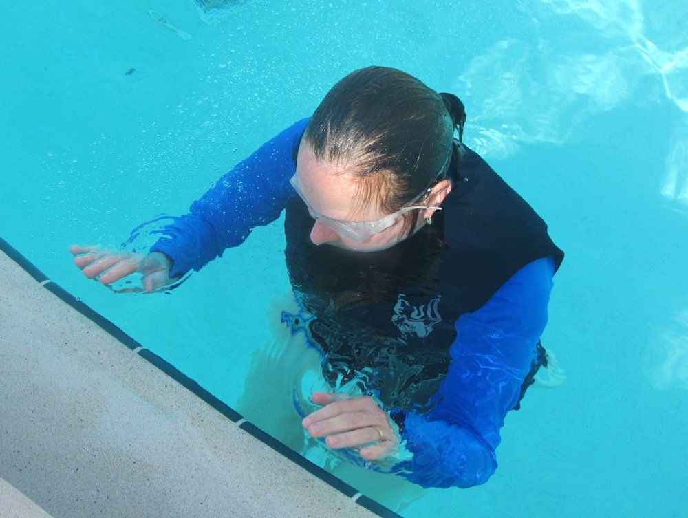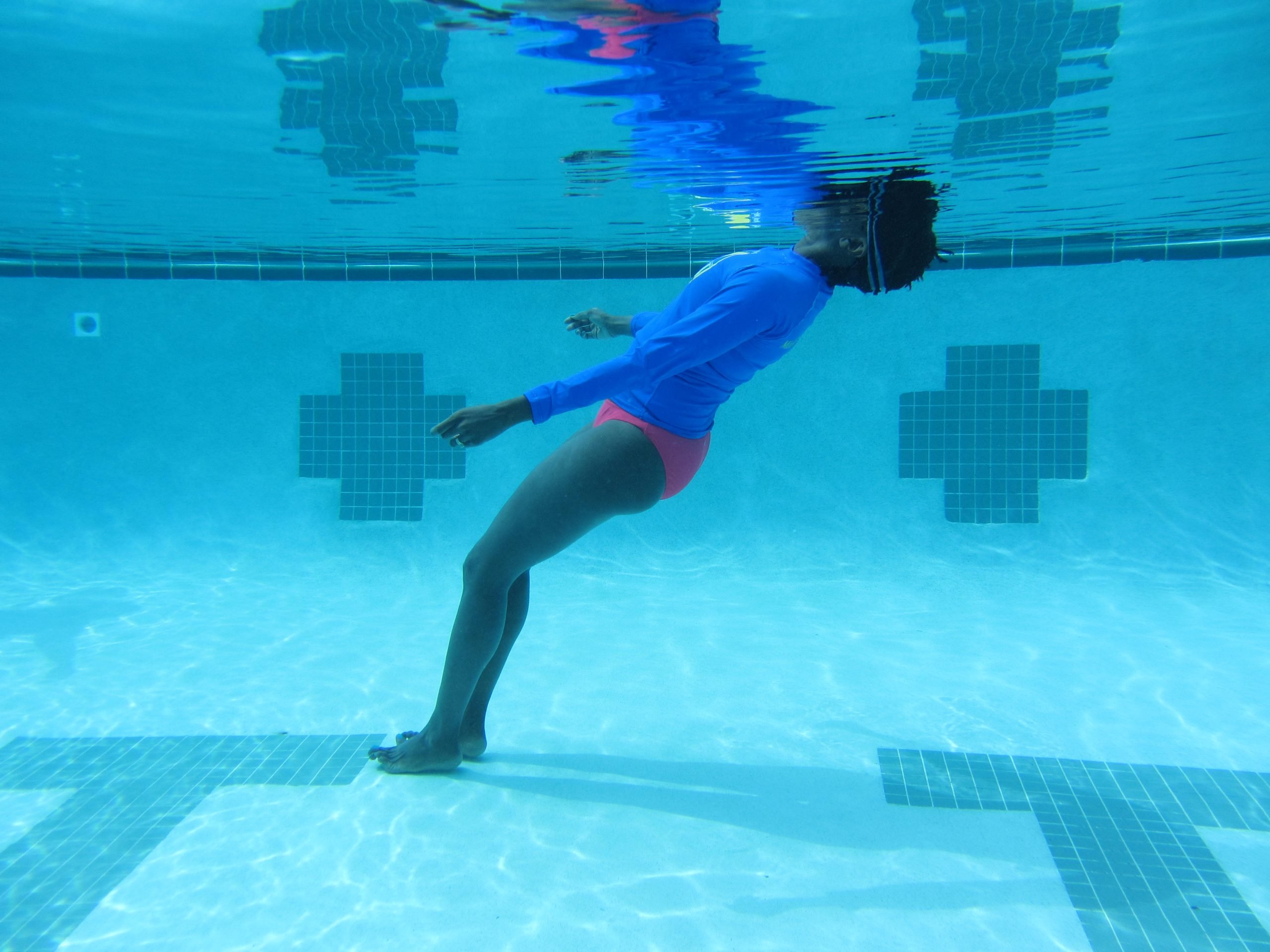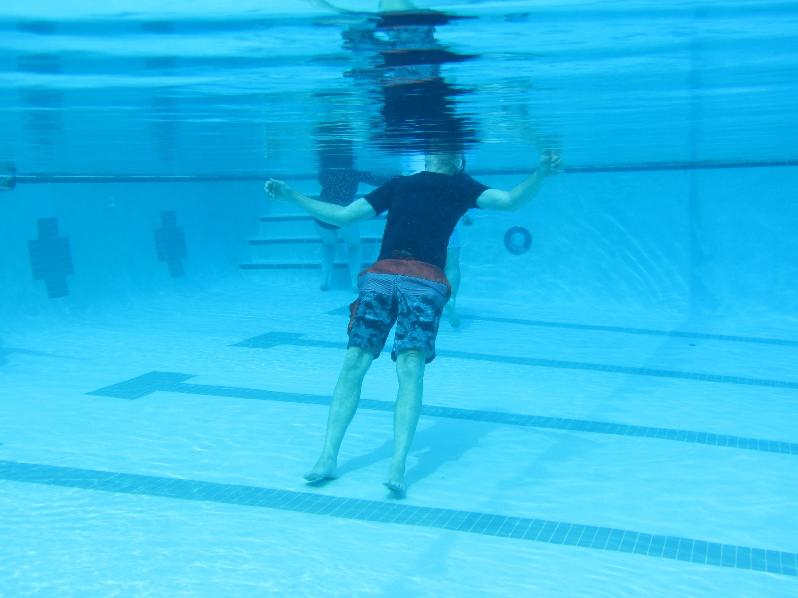 Our pool ranges from 0 to 5.5 feet deep. We will go to a deeper pool when you’re ready.